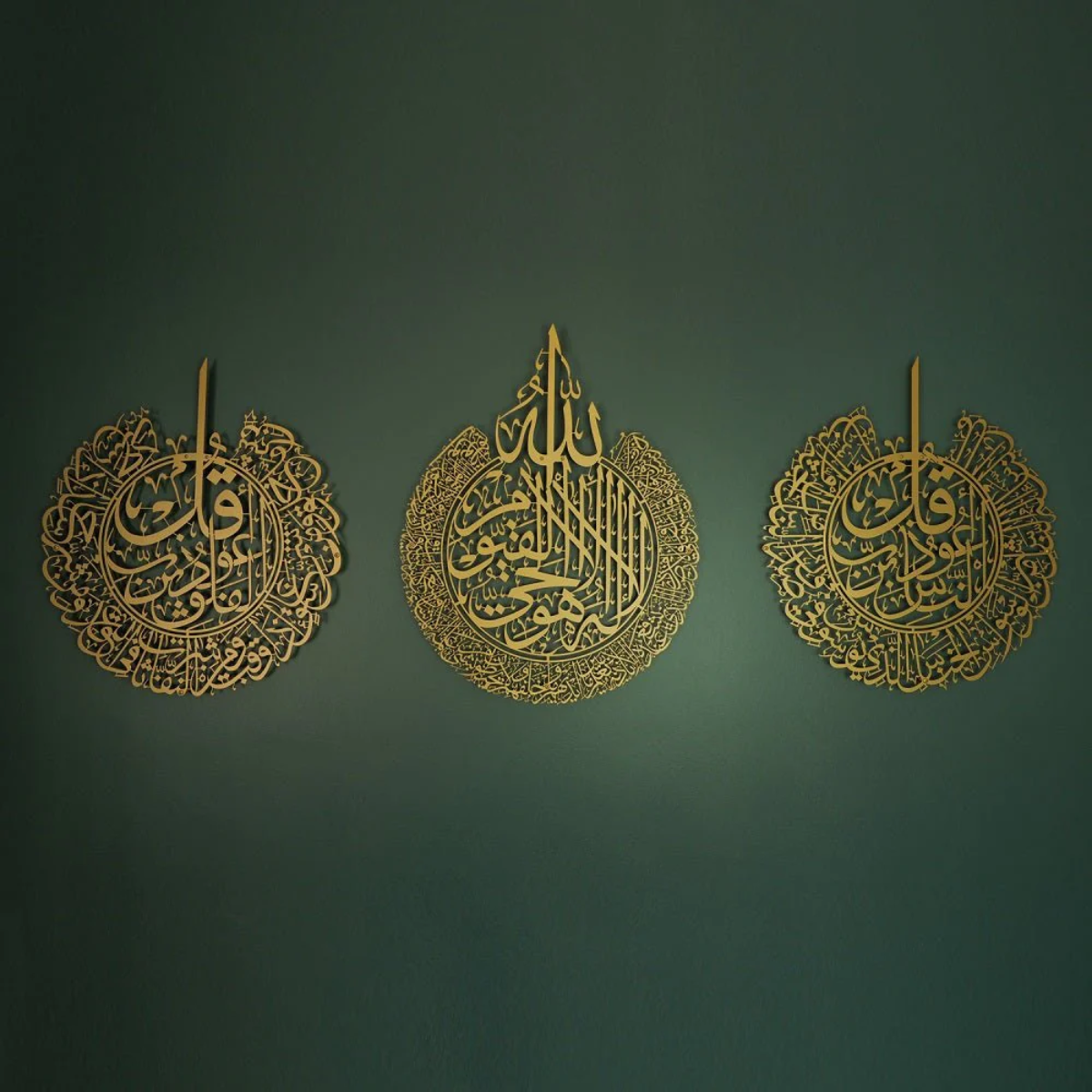 Ayatul Kursi, Surah Al-Nas And Surah Al-Falaq Metal Islamic Wall Art, Set of 3 Pieces