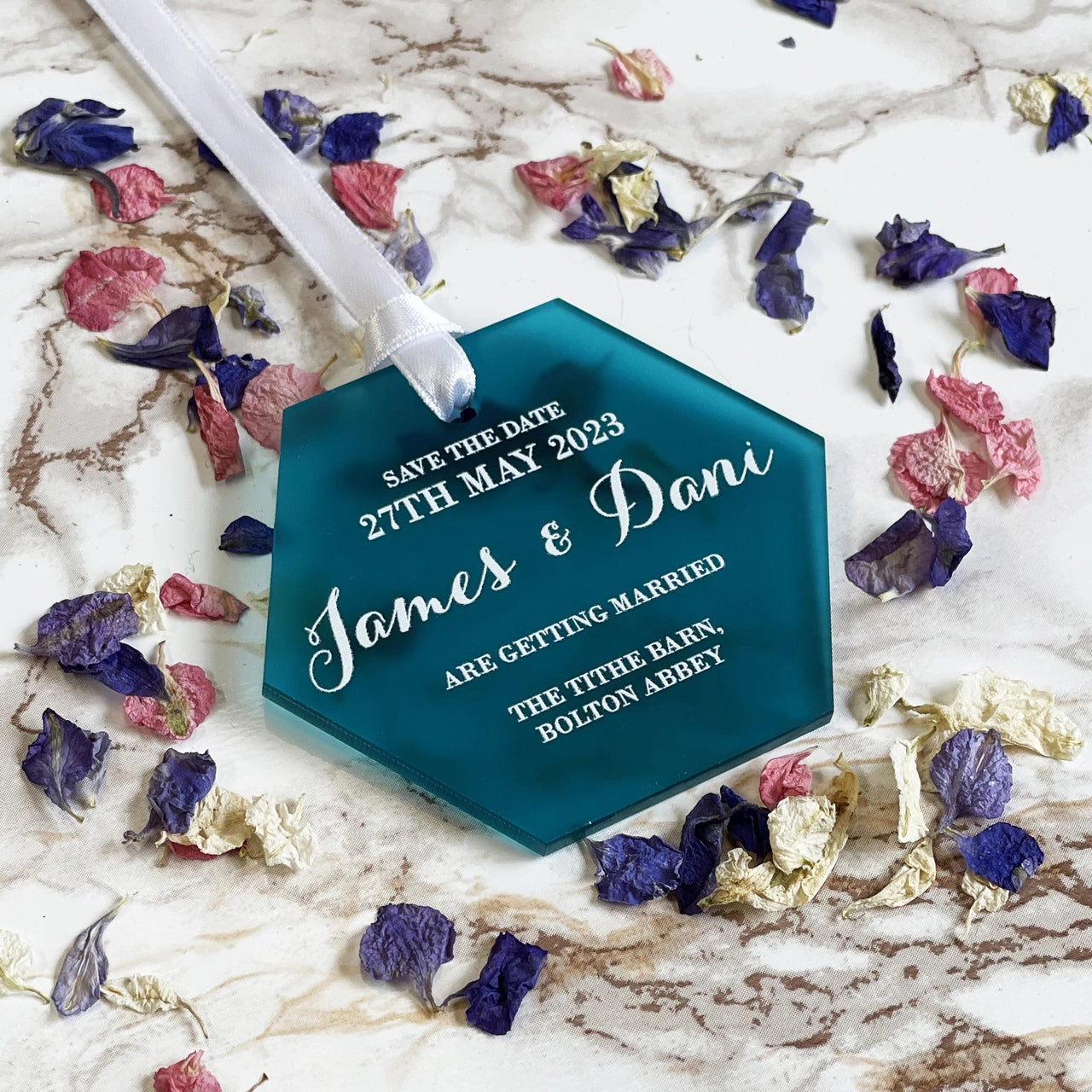 Hexagon Save the Date Tags for Wedding Date Announcement