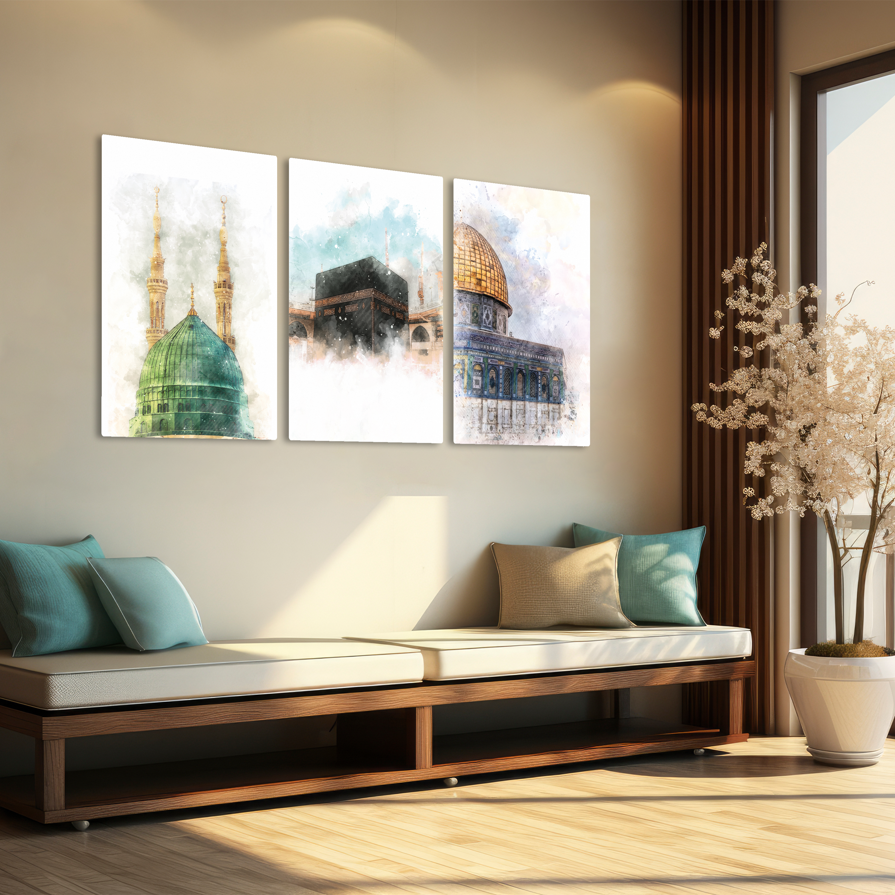 Trinity of Faith: Kaaba, Medina & Al Aqsa, Set of 3 Metal Poster